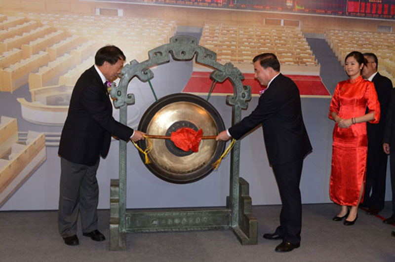 集團(tuán)董事長(zhǎng)劉志江(右)與天津市政府副秘書(shū)長(zhǎng)袁樹(shù)謙共同為中材節(jié)能上市敲鑼