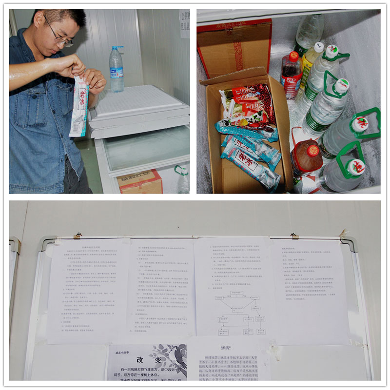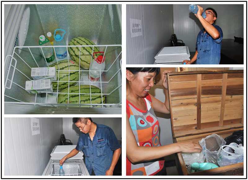左上:公司為職工們添置的冰柜 右上:仰天長飲,享受片刻的清涼